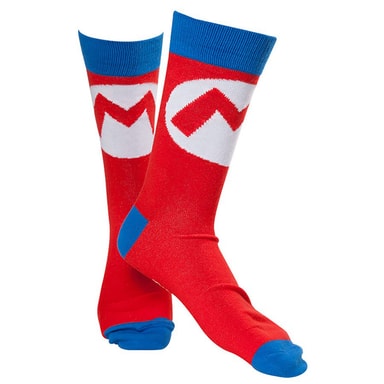 Røde og blå strømper med Mario-motiv. 74 procent akryl med 22 procent polyester, 3 procent elastan og 1 procent polyamid. Europæisk størrelse 43 til 46.