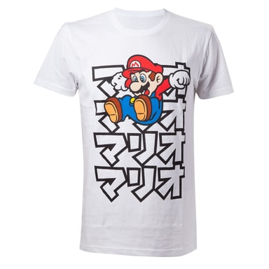 Hvid t-shirt med Nintendo - Japanese Mario -tema. 100 procent bomuld, størrelse XXL, svarende til europæisk størrelse 56.Læs mere om produktet