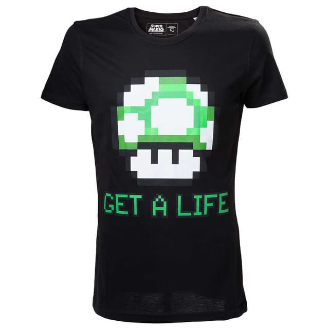 Sort t-shirt med Nintendo - Mario Get a Life -tema. 100 procent bomuld, størrelse XXL, svarende til europæisk størrelse 56.Læs mere om produktet