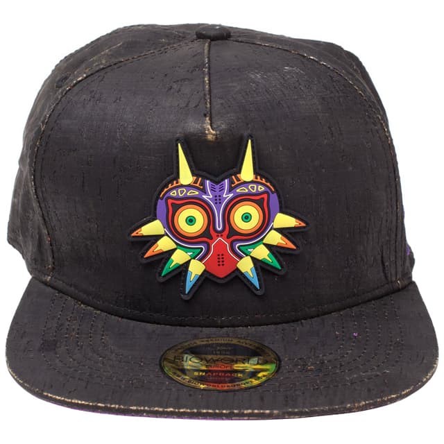 Sort snapback cap med Majoras maske i gummi (fra The Legend of Zelda-spillet) på fronten. Lavet af kork, one-size.Læs mere om produktet