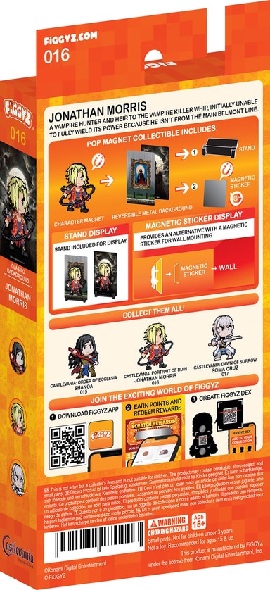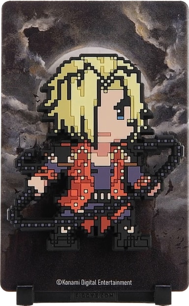 First 4 Figures Figgyz Castlevania actionfiguren har en vendbar metalplade på bagsiden med to forskellige displaymuligheder, en pixel-art-inspireret figur, en 3D-magnetisk pop-out-effekt, en displayfod og en magnetisk sticker.