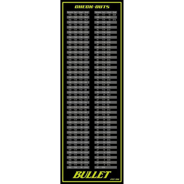 Der er et check-out bord på Bullet Check Out dartmåtten. Det beskytter også gulvet mod slitage og beskytter spidserne af pilene, når de falder ned på tæppet. Undersiden af måtten har en skridsikker overflade for at holde den på plads. Kassebord på overfladen af tæppet Størrelse: 80 x 237 cm Materiale: polyester Anti-skrid overflade på undersiden af tæppet