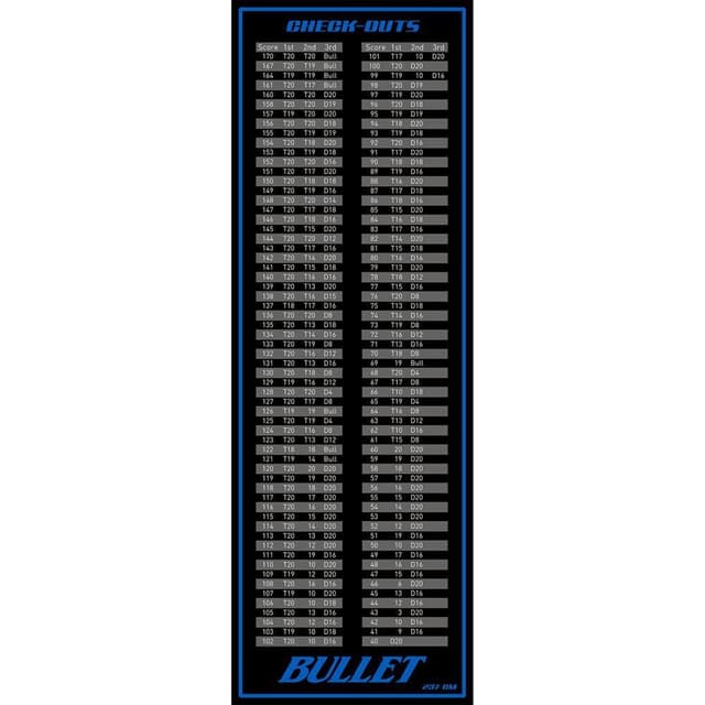 Der er et check-out bord på Bullet Check Out dartmåtten. Det beskytter også gulvet mod slitage og beskytter spidserne af pilene, når de falder ned på tæppet. Undersiden af ​​måtten har en skridsikker overflade for at holde den på plads.Læs mere om produktet