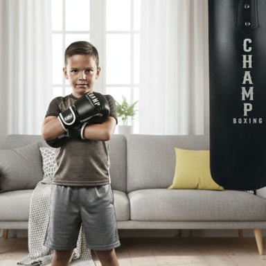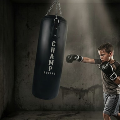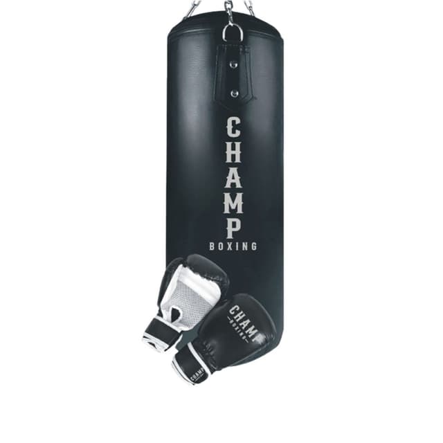 Champ Junior Boksesæt i sort/sølv er det ideelle startsæt til børn, der vil i gang med boksning derhjemme. Sættet består af en robust sandsæk på 11 kg og 60 cm i længden samt et par matchende boksehandsker i sort med sølvdetaljer – skabt til at imponere både visuelt og funktionelt.