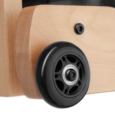 Rammen på fitnessudstyret imponerer med sin praktiske klapfunktion, der gør det nemt og pladsbesparende at opbevare. De kuglelejede gummihjul skåner samtidig gulvet.