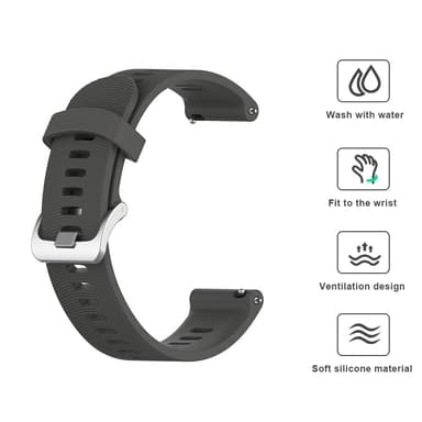 Sporty silikonearmbånd, der passer til Garmin Forerunner 245 og andre sportsure med 20 mm armbåndsbredde. Remmen er lavet af blødt og vandafvisende materiale med mange ventilationshuller, der lader huden ånde. Det føles behageligt omkring håndleddet og er perfekt som sportsarmbånd.