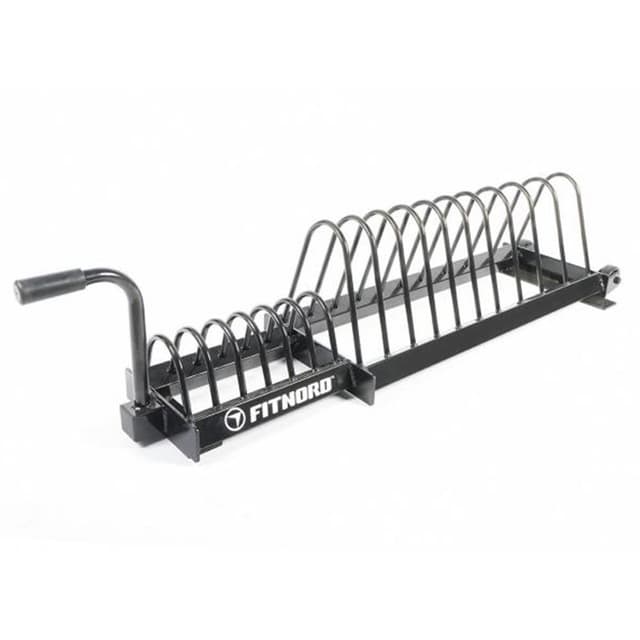 Vægtpladestativ til ti større (84 cm) og seks mindre (32 cm) vægtskiver. Stativet leveres med et håndtag og et transporthjul. specifikationer Totallængde: 150 cm Bredde: 42 cm Højde: 33 cm Vægt: 21 kg Farve: Sort