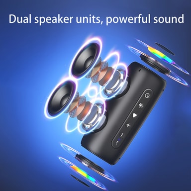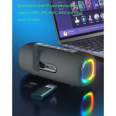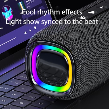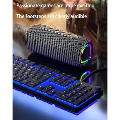 Fängslande ljudupplevelse: Utrustad med en kraftfull subwoofer levererar denna högtalare djup, dundrande bas, vilket gör den perfekt för att förbättra dina spelsessioner och utomhusfester. RGB-ljusen lägger till ett dynamiskt visuellt element som synkroniseras med rytmen för att skapa en fängslande audiovisuell fest.