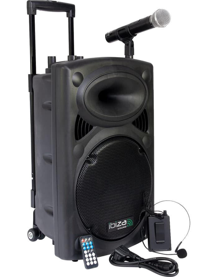 Ibiza Sound transportabel 12"" højttaler. USB, MP3, WMA og Bluetooth afspiller. 2 x trådløse VHF-mikrofoner. Indbygget oplader og genopladeligt batteri. Håndtag og hjul til nem transport. Læs mere om produktet