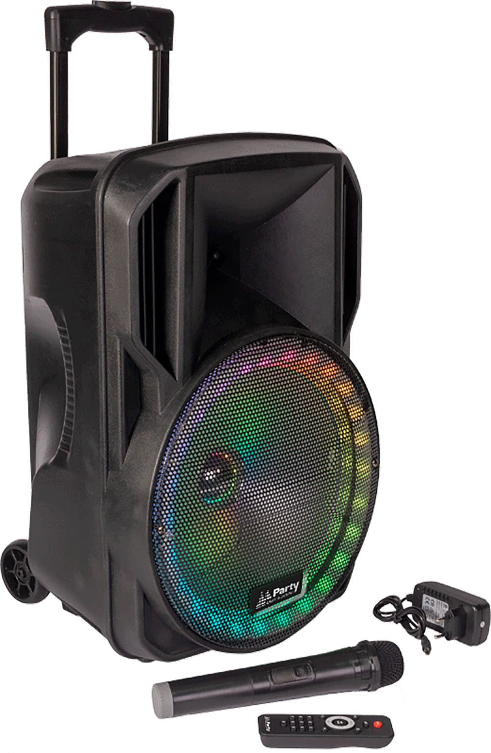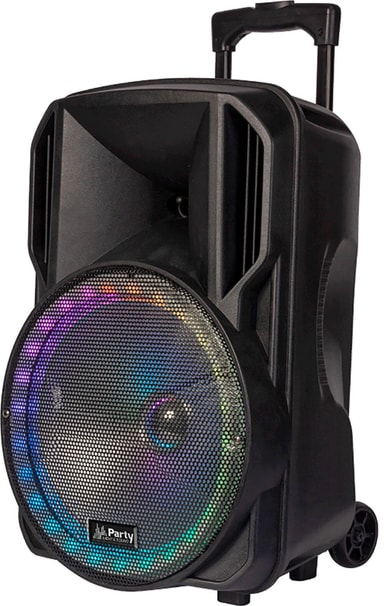 Indbygget batteri.  LED Lysshow i basenhed.  Afspiller via Bluetooth.  USB tilslutning.  Trådløs mikrofon medfølger.  Hjul og håndtag = nem transport. Læs mere om produktet