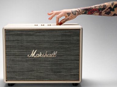 Klassisk vintage-design: Woburn højttaleren fra Marshall har et klassisk design med en vintage-front, guldfarvet metaldetaljer samt det ikoniske Marshall logo.