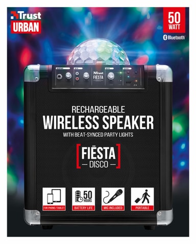 Urban Revolt Fiesta Disco er en trådløs højttaler, der er perfekt til enhver fest og begivenhed. Takket være den kraftfulde 50 Watt lyd, indbygget lysshow og mikrofon til karaoke kan du have det sjovt med dine venner og familie, når du lytter til din yndlingsmusik.