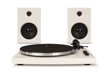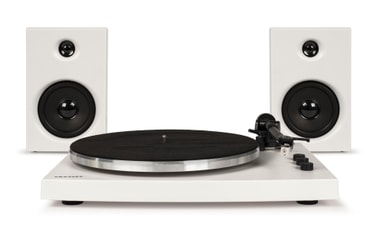 Crosley T150 - HvidStilren og minimalistisk komplet pladespillersystem.2x super afbalancerede 4""15W højtalere i kompakt størrelse.Afspiller med to hastigheder: 33 og 45 RPM.Full-size pladetallerken i aluminium.Pladespilleren har en behagelig lyd pågrund af tonearmen med den justerbarer modvægt og NP5 diamant nålen.Kan også spille digitale lydmedier via Bluetooth eller analogt via AUX.Bælte-drevet motor.