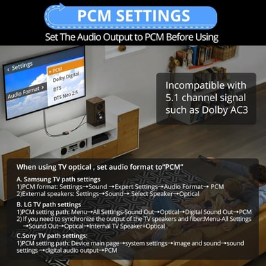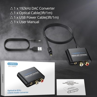 SpecifikationerIndgang: Optisk (Toslink/SPDIF) digitalt lydsignalUdgange: 2 × RCA (L/R) og 1 × 3,5 mm stereoSamplingfrekvens: Op til 192kHzBitdybde: Op til 24-bitLydformat: PCM (stereo)Kompatibilitet: TV, Blu-ray-afspillere, spillekonsoller og andre enheder med optisk lydudgangStrømforsyning: USB (5V) (strømadapter medfølger ikke)Funktion: Kun digital-til-analog (ikke bi-directional)Understøtter ikke: DTS 5.1 eller Dolby AC3
