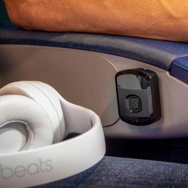 flyTUNES sender et trådløst Bluetooth® lydsignal fra tv-skærmen i flyet til dine yndlings trådløse hovedtelefoner. flyTUNES kan tilsluttes enhver 3,5 mm AUX-udgang og parres hurtigt med bluetooth hovedtelefoner eller ørepropper, hvilket giver dig optimal lyd og komfort og frigør dig fra irriterende kabler. Eller - du kan spille trådløst, når du tilslutter flyTUNES til AUX-stikket på din Nintendo Switch eller andre bærbare gamerenheder og parrer med dine foretrukne trådløse hovedtelefoner. Med de to sammenklappelige stænger kan flyTUNES tilsluttes en enkelt- eller dobbeltudgang, så det fungerer i enhver flymodel.