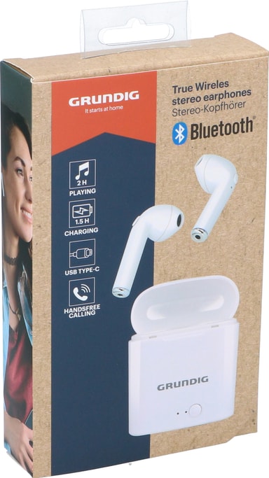Disse Grundig Earbud trådløse earbuds leverer klar lyd med SBC/AAC-understøttelse, stabil Bluetooth 5.0, en ergonomisk pasform, touch-betjening, mikrofon og et kompakt opladningsetui.Læs mere om produktet