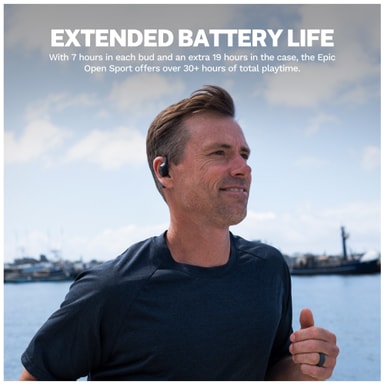 JLab Epic Open Sport true wireless in-ear hovedtelefoner tilbyder fremragende lyd, sikker lytning, 30 timers batteri, 3 lydindstillinger, IP55-certificering og premium lydkvalitet. Ideelt til daglig brug og intens træning.Læs mere om produktet