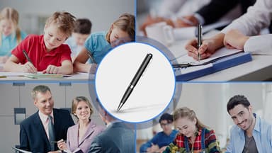 Mini stemmeoptager i pendesign: Optagepennen optager med kun ét tryk, selv når du skriver. Med 16 GB hukommelse, spole frem og tilbage, lokal sletning, stemmeaktiveret optagelse og USB-stick-funktion.