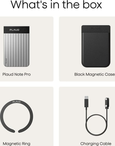 Hver PLAUD AI note taker leveres med en månedlig transskriptionskvote på 300 minutter, et magnetisk etui, en magnetisk ring og et opladningskabel, hvilket giver alle nødvendigheder fra starten.