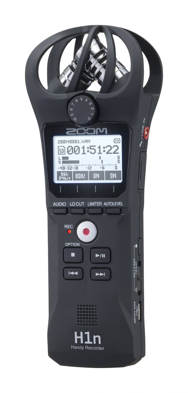 Zoom Recorder H1n Denne recorder er både lille og billig, men enhederne og kvaliteten er stadig helt i top, som man efterhånden forventer, når produktet komme fra Zoom. Recorderen er perfekt i øvelokalet til at få ideer og skitser optaget og egenr sig også fantastisk live. X/Y stereomikrofonen sørger for en klar og god stereooptagelse og de vitale instillinger så som track marker, auto record, low cut filter, level og volume justeres nemt og smertefrit fra recorderen. Optageren kan køre op til 10 timer på to AAA batterier, optager på microSD-kort og har stativgevind, så den let kan opsættes og placeres ideelt.