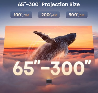 Projektoren tilpasser sig alle skærmstørrelser fra 65” til 300”, så du kan projicere på væggen i stuen eller i baghaven.