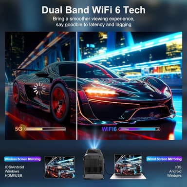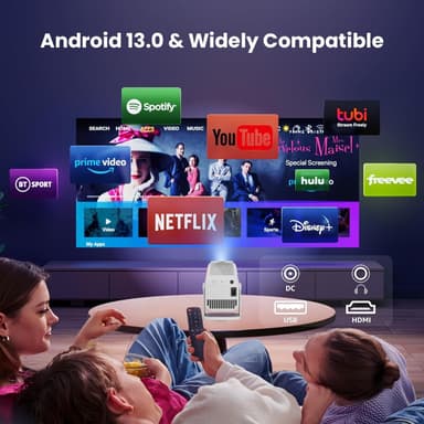 Denne produkt er en Android 13.0 smart projektor med indbygget operativsystem, designet til at levere skarpt billede og høj ydeevne. Med native 1080p opløsning, støtte for 4K HDR, 300 ANSI lumen lysstyrke og kontrastforhold på 8000:1 får du levende farver og detaljeret billede. Projektoren har WiFi 6 og Bluetooth 5.0 for problemfri trådløs forbindelse samt støtte til skærmspejling via Airplay og Miracast.