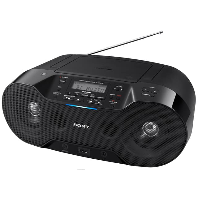 Nyd al din musik i en fantastisk kvalitet med Sony ZS-RS70BTB CD Boombox og føl beatet med Mega Bass. Vælg om du vil høre radio i digital kvalitet, afspille CD’er eller nyde din egen playliste. Skab forbindelse med afspilning via USB, jack-stik eller brug Bluetooth med NFC til at skabe trådløs forbindelse via et enkelt tryk. Tag denne boombox med dig rundt i huset eller tag den med til havefesten, da den har 7,5 timers CD afspilning og op til 9 timers radio, når den bruger batteri (seks stk. C batterier).