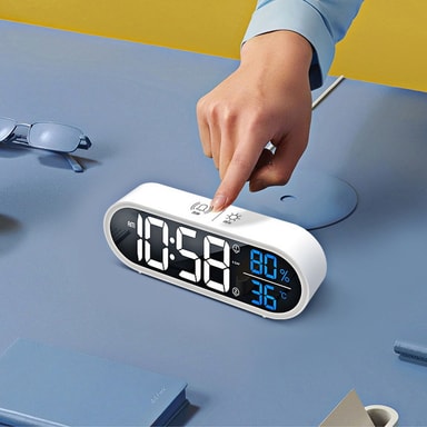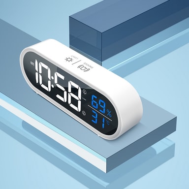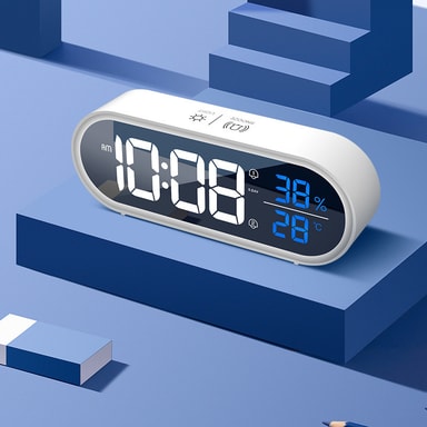 Stemmestyringsfunktion: Vækkeuret har en stemmestyringsfunktion. Når omgivelserne er stille, slukker skærmen automatisk for at undgå at forstyrre søvnen, og den vil automatisk lyse, når der er en lyd.