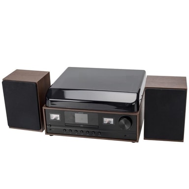 Vinyl-spelare, Radio och CD. Streama musik från mobil via Bluetooth. Fräcka VU-mätare på framsidan. Hörlursuttag och AUX-ingång. Fjärrkontroll ingår liksom högtalare.