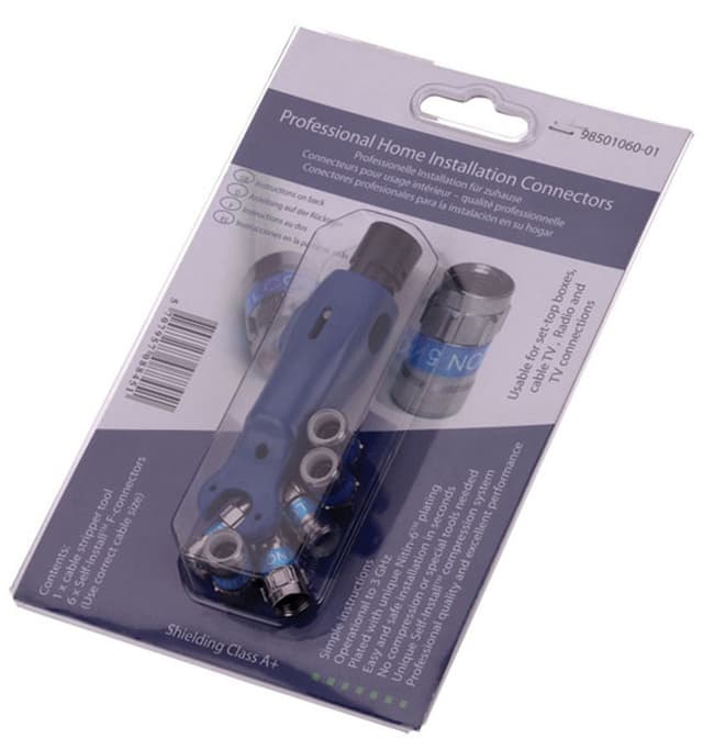 Dette antennesæt indeholder et værktøj til skalering af kabler samt seks F-connectorer med selvinstallerende system. Connectoren vil automatisk fange forbindelsen til kablet. Dette sikrer, at du slipper for brug af værktøjer.