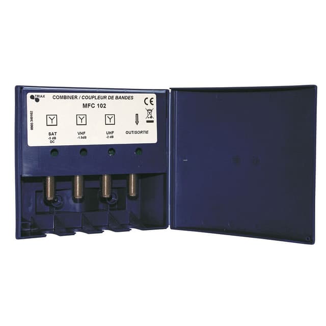 Denne kabelsamler/-splitter Triax 340111 er til FM, TV eller satellitsignal. Samleren følges af en F-fatning, og har en frekvensrækkevidde på 950-2.150 MHz.