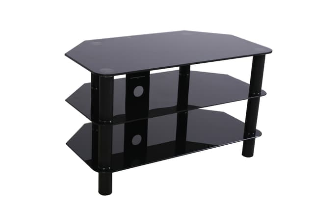 Elegant TV-bord i højglanset sort finish med bagplade og fødder i metal. TV-bordet har tre hylder i hærdet glas, så du har masser af plads til dine AV-enheder som set-top-box, Blu-ray afspiller og spillekonsol.