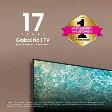 2 Ifølge en undersøgelse gennemført af Kantar Sifo i januar 2023 er 93 % tilfredse med deres Samsung-TV. Resultaterne er ikke udtryk for en anbefaling af Samsung. Enhver tredjepart, som henholder sig til disse resultater, gør det på egen risiko.