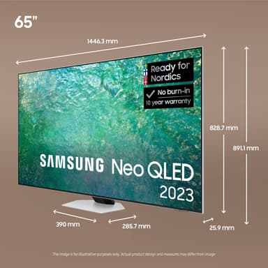 4 Garantien gælder i 10 år fra købsdato. Forudsætter kopi af købskvittering og registrering på Samsungs websted inden for 90 dage efter køb. Gælder for køb foretaget i perioden fra 20.04.2023 til 31.03.2025 af udvalgte TV-modeller fra 2023. Vilkår og betingelser kan ses på: https://www.samsung.com/dk/offer/offline/screen-burn-warranty/