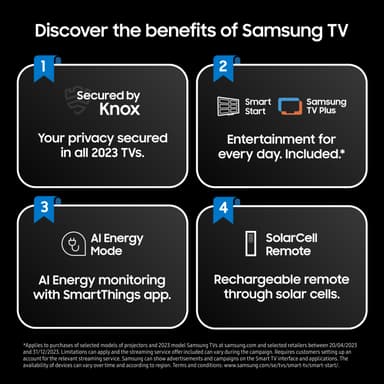 3 Gælder ved køb af udvalgte Samsung TV-modeller fra 2023 og udvalgte projektorer på samsung.com og hos udvalgte forhandlere i perioden 20.4.2023 – 31.12.2023. Der kan være begrænsninger, og udvalget af streamingtjenester kan variere under kampagnen. Kræver, at kunden opretter en konto hos den aktuelle streamingtjeneste. Samsung kan vise reklamer og kampagner på Smart TV-grænsefladen og applikationer. Tilgængeligheden af apps kan variere alt efter tid og land. Betingelser: samsung.com/dk/tvs/smart-tv/smart-start.