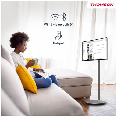 Thomson Go Plus 32" UHD smart skærm tilbyder 4K-billede, touchskærm og indbygget batteri. Med Android, hjul og justerbare vinkler er den ideel til underholdning, læring eller arbejde.Læs mere om produktet